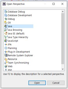 Open Perspective 창에서 Java ☞click Open ☞click