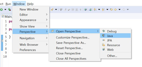 Window ☞click Perspective ☞click Open Perspective ☞click Java ☞click